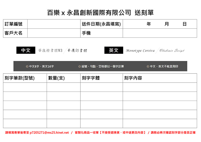 1.請將客製化刻字需求填寫清楚,寄至p7205271@ms25.hinet.net