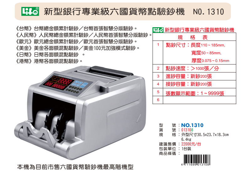 徠福 新型銀行專業級六國貨幣點驗鈔機 / 台 NO.1310