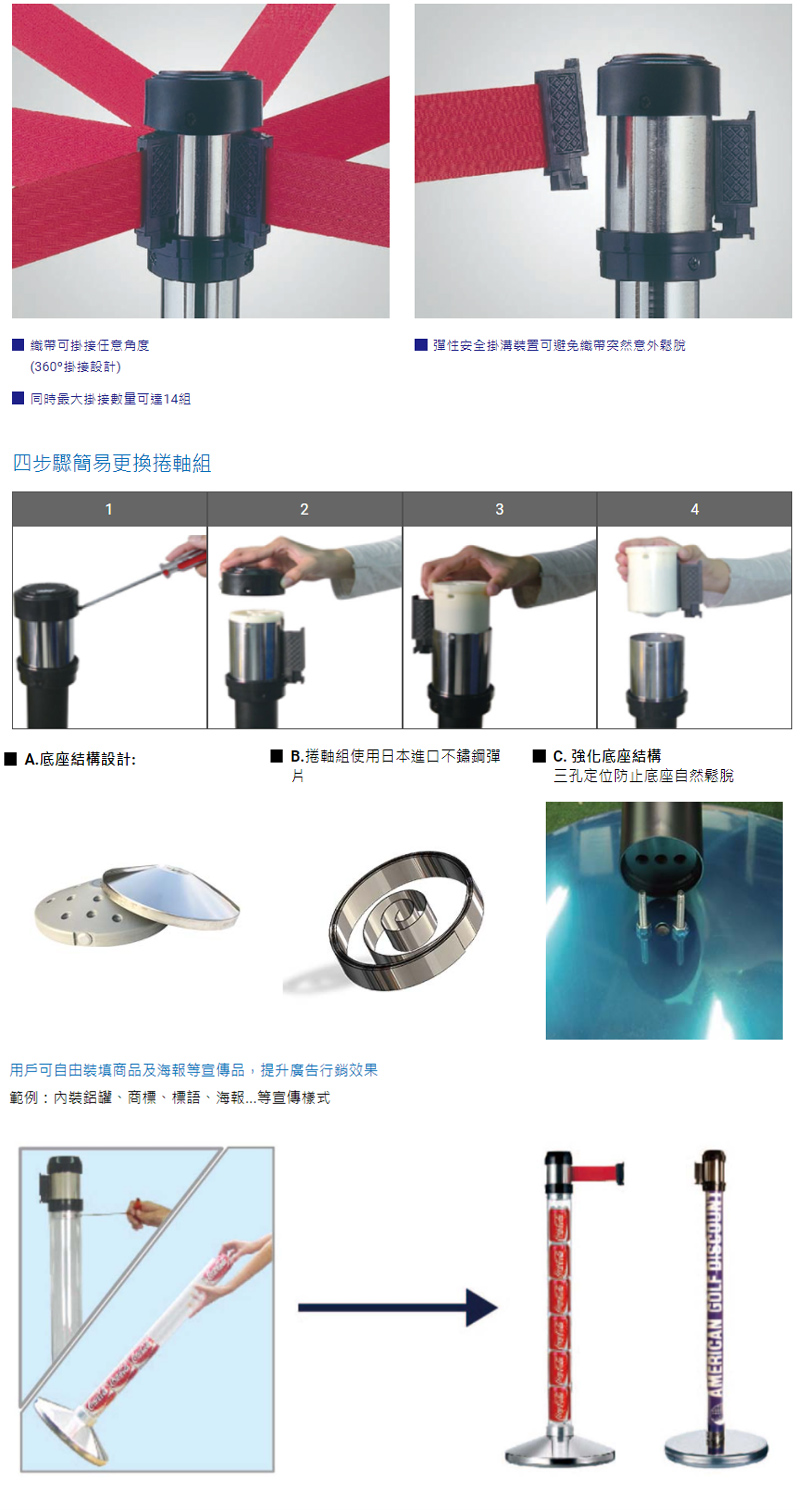 伸縮帶圍欄、海報架、告示牌廣告系列、垃圾桶、折疊傘架、自動雨傘套袋機、拒馬、推車等商店設備。