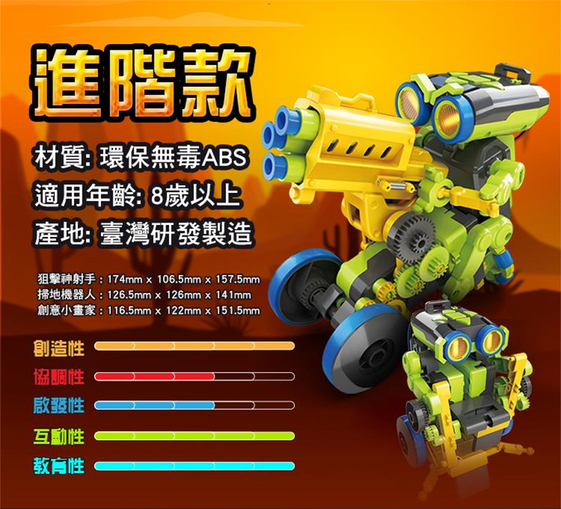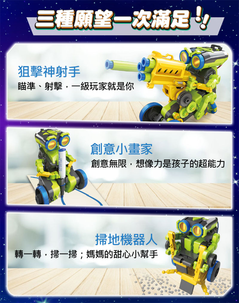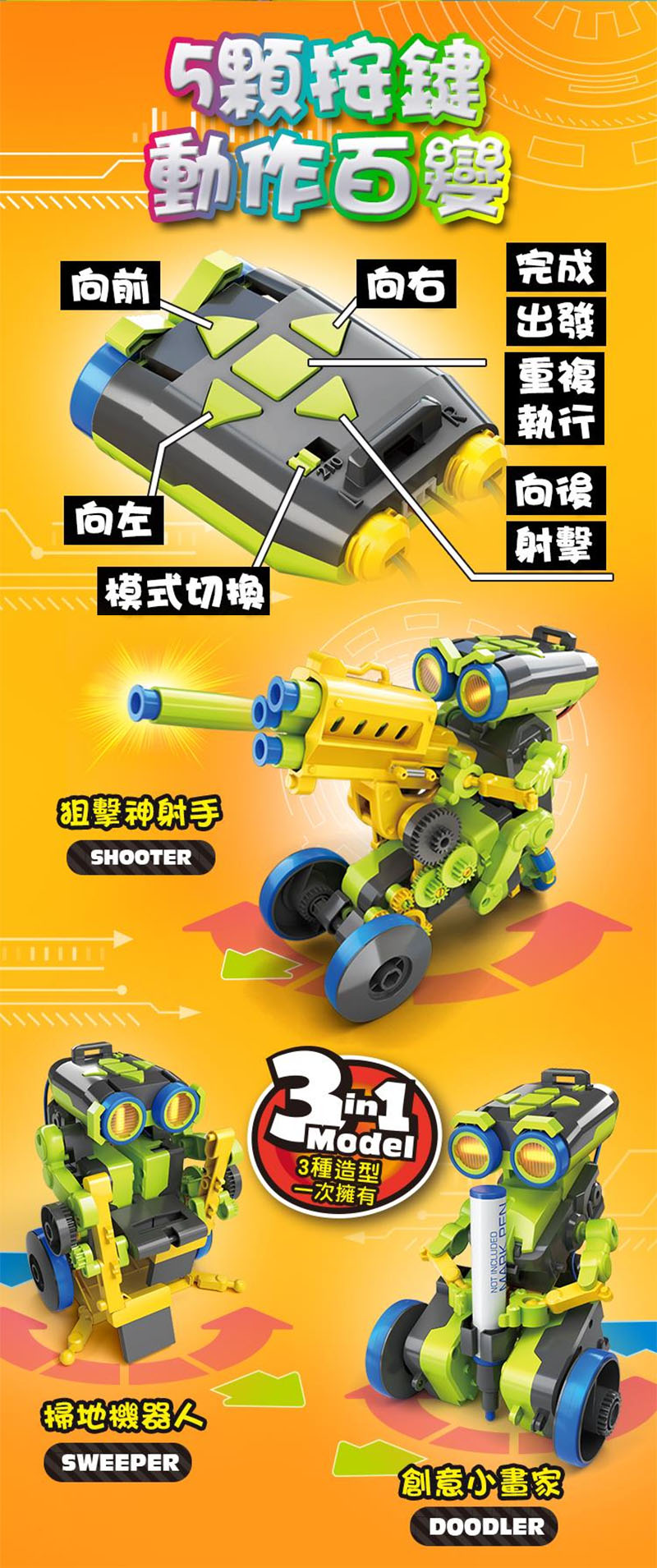 3合1按鍵編程機器人,有 神槍手/小畫家/掃地機器人 三種造型變化