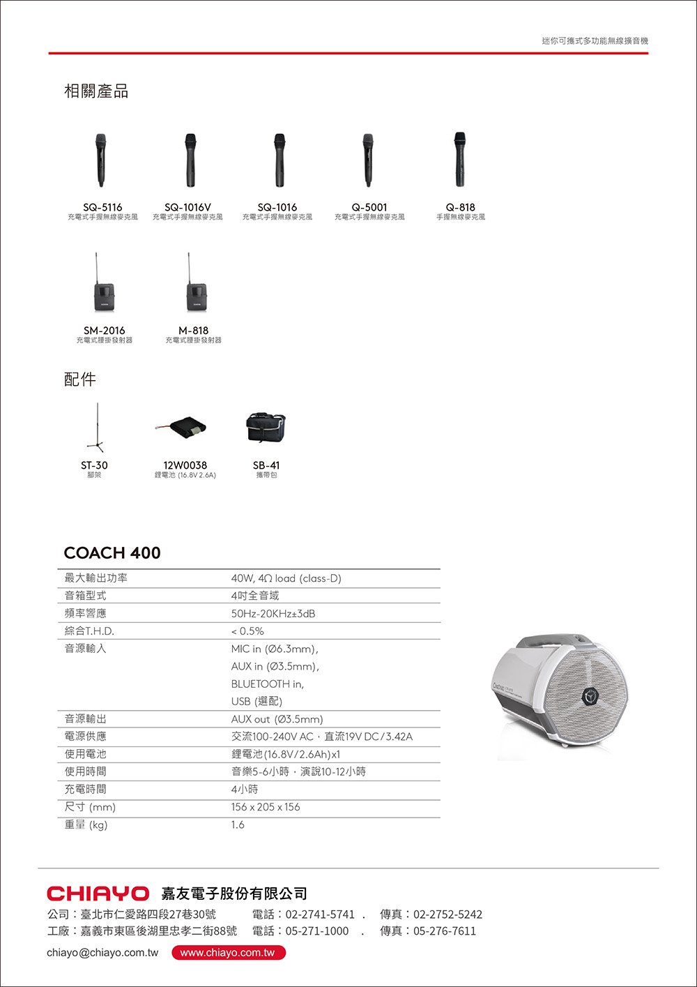 COACH 400 內建高效能 CLASS D 數位功率放大器,能夠驅動 4 吋全音域喇叭,提供強勁且清晰的音效,適合教學、會議、導覽、戶外教學、集會遊行和廟會等場合。這款無線擴音機具備藍牙、USB 和 SD 播放功能,支持多種音源輸入,並內建 3.5mm 插孔,方便連接手機、MP3 播放器等設備,讓您可以靈活播放背景音樂、進行講解或演出。COACH 400 的設計考慮到了用戶的各種需求,讓您能夠隨心所欲地掌控音訊,提供卓越的音質和便捷的操作。此外,這款擴音機還支持錄音和播放功能,讓您的講解和演示更具靈活性。內建的錄音功能能夠讓您即時錄製講解內容,無論是在教學過程中保存重要片段,還是為會議記錄要點,都非常方便。錄製的內容可以直接播放,幫助您在多次演講或教學中使用預錄的資料,減少重複講解的負擔。COACH 400 不僅是一台擴音機,更是一個全方位的聲音管理工具。