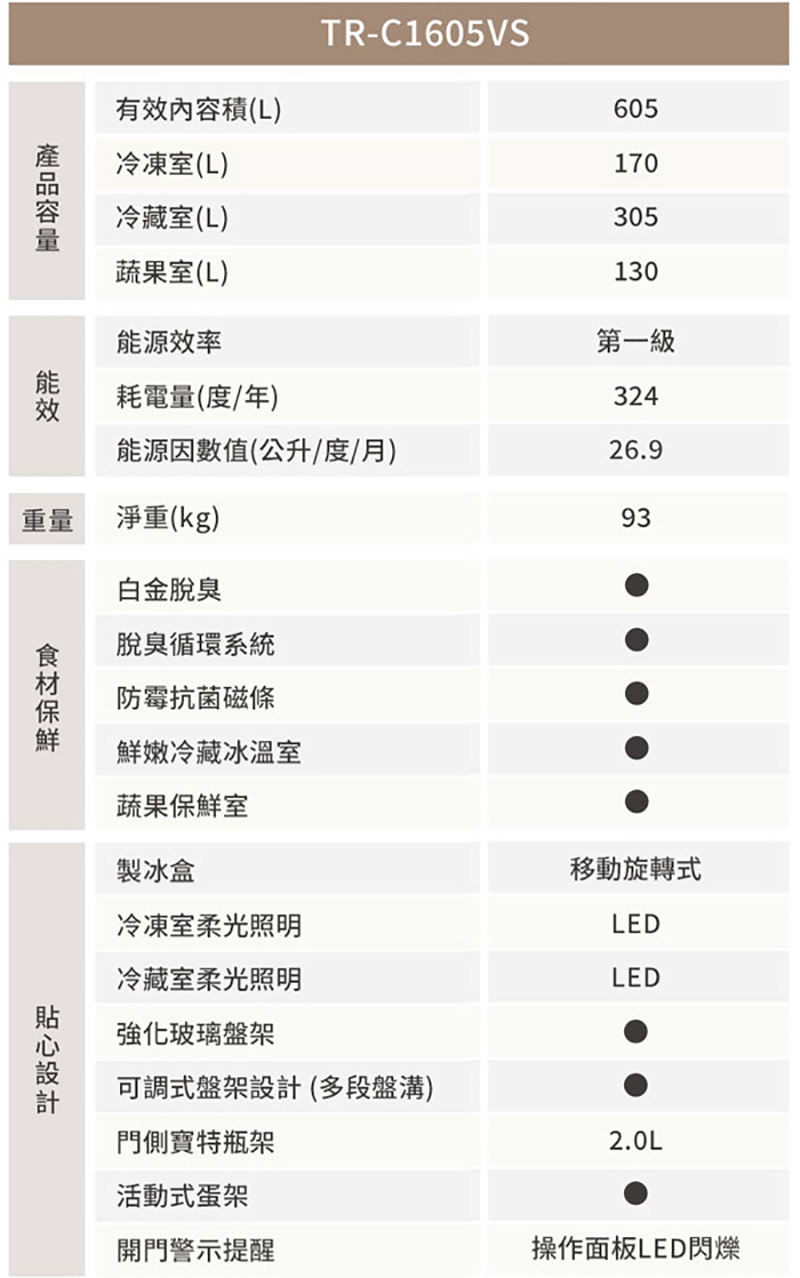 ◎305L冷藏室(含37L生鮮微凍室)、130L蔬果室