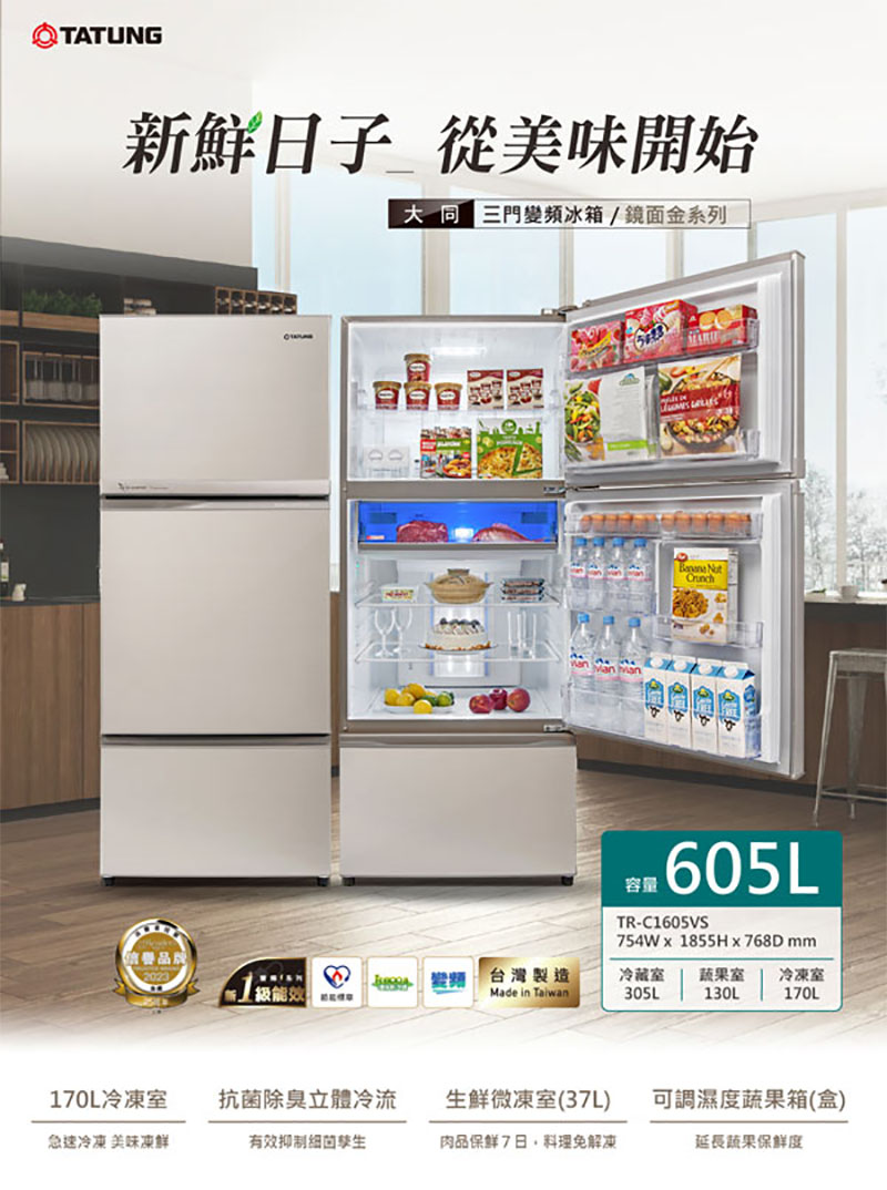 TATUNG大同 605L 一級能效 變頻三門冰箱 /台 TR-C1605VS
