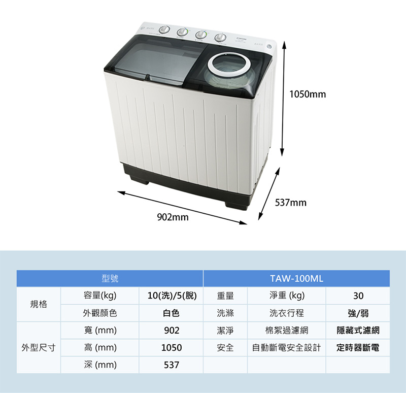 TATUNG大同 10kg 雙槽洗衣機 /台 TAW-100ML