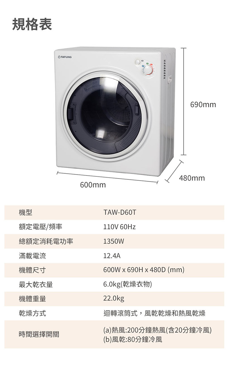 TATUNG大同 6kg 乾衣機 /台 TAW-D60T