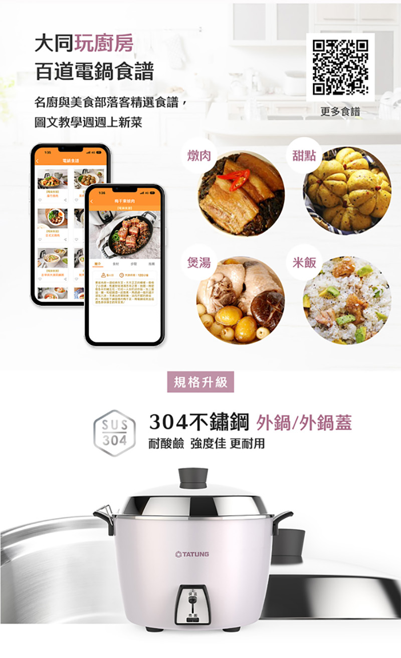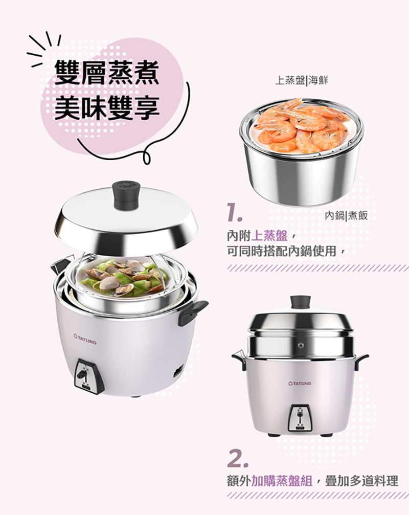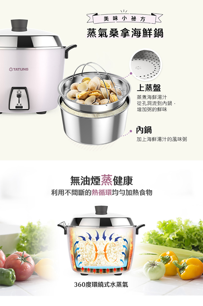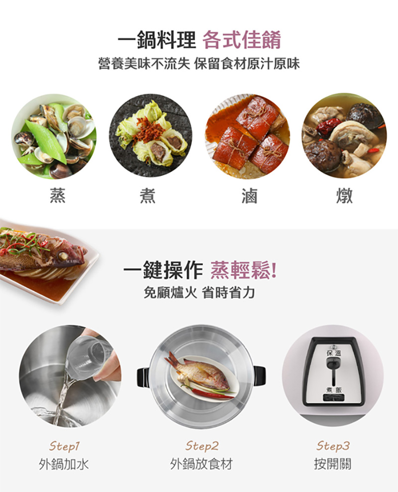 ◎多元料理,煮飯/粥、蒸、滷、燉多用途