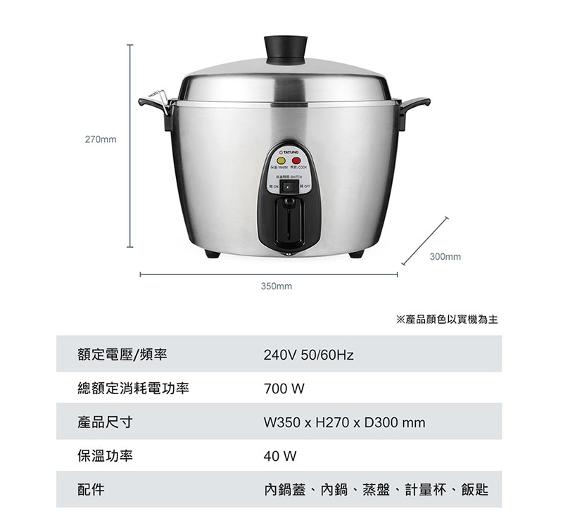 配件:內鍋、內鍋蓋、蒸盤、量米杯、飯匙