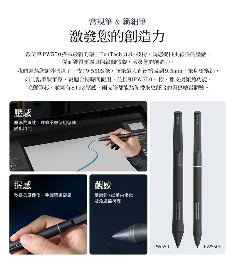 ●Huion PenTech 3.0+最新筆技術,使用更自然舒適。