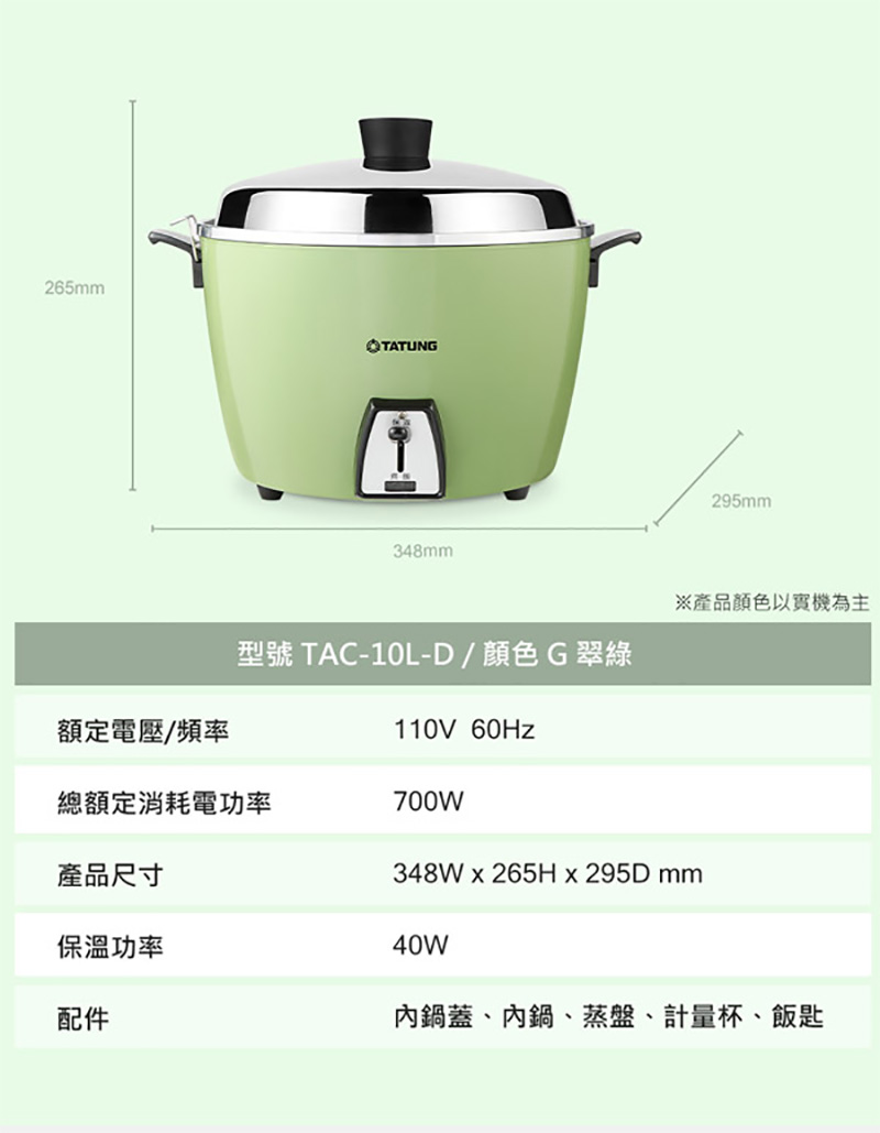 配件:主體:外鍋、內鍋、外鍋蓋各一 配件:內鍋蓋、蒸盤、量米杯、飯匙各一