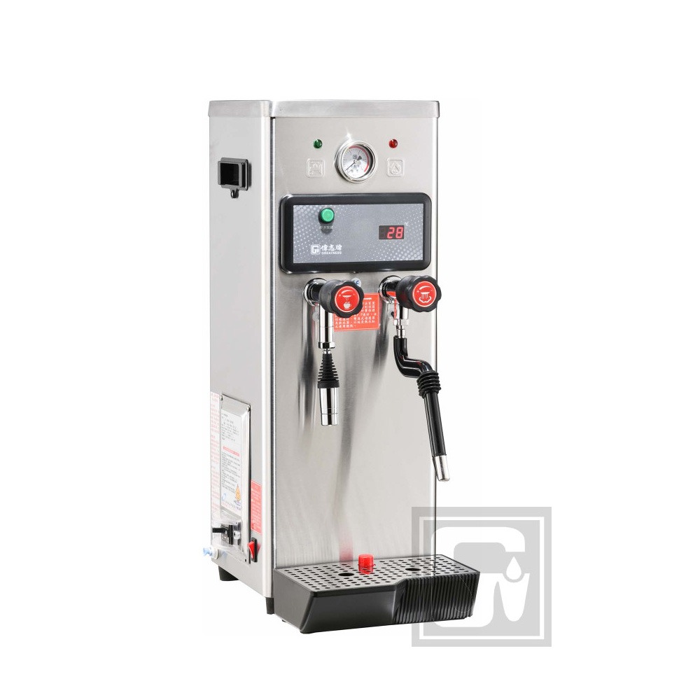 7.整台不銹鋼砂面設計,面板設有壓力錶、進水指示燈 及加熱指示燈、蒸汽龍頭及開水龍頭採 用手握 旋轉式,可控 制蒸汽之大小及開水之出水量方便操作。
