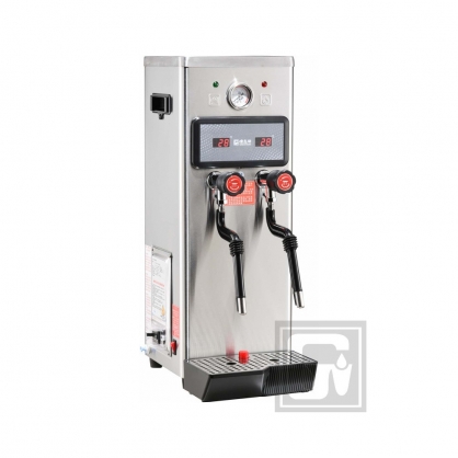 7.整台不銹鋼砂面設計,面板設有壓力錶、進水指示燈 及加熱指示燈、蒸汽龍頭及開水龍頭採 用手握 旋轉式,可控 制蒸汽之大小及開水之出水量方便操作。