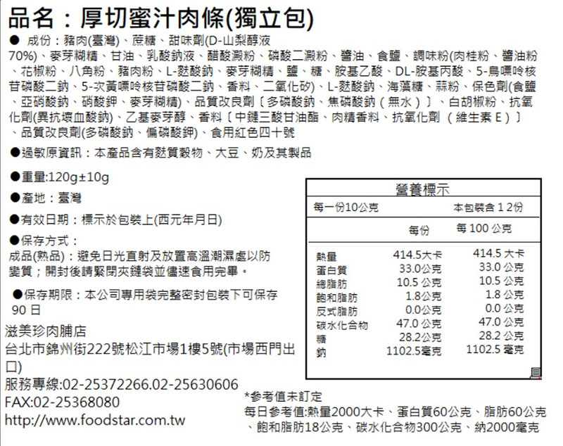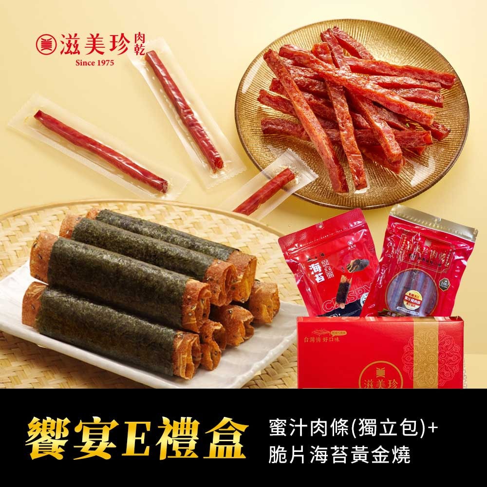 禮盒尺寸:約 34.2*27*7.3cm附品牌提袋 【滋美珍蜜汁豬肉條】獨立包裝 經典甘甜好滋味!嚴選豬肉製成,搭配獨家蜜汁配方, 香甜軟嫩,一口接一口,是您隨時解饞的美味零食。 【豬肉脆片海苔 黃金燒】 純手工製作,無添加 “防腐劑” 與 “人工色素”天然無負擔、健康滿分。 注意事項: 豬肉紙與海苔都是極低含水量的產品,一旦接觸空氣後就開始吸收空氣中的水分子, 容易造成產品軟 化影響口感,所以,為避免影響口感開封後請儘速食用完畢,或妥善封存。 豬肉原產地:台灣 成分:豬肉.杏仁片(堅果製品).優質海苔.糖.醬油.L-麩酸鈉.D-山梨醇液. 醋酸澱粉.抗氧化劑.亞硝酸鈉.抗氧化劑.甘草萃.醋黃內酯鉀.香料.丙二醇 保存期限:180天(未拆封) 過敏原資訊:「本產品含有堅果製品,不適合對其過敏體質者食用」 【廠商介紹】 1975年,市場小攤的家人故事從松江市場的一個小攤位開始,滋美珍由一對夫妻攜手創立。 他們用簡單的食材與真誠的心,製作每一塊肉乾,承載著對家人的愛與對品質的堅持。 每一口,都是家的味道。 廠商代碼:YA5 責任代碼:QMW