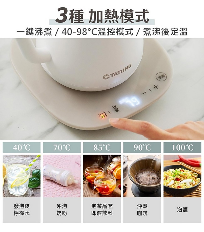 3種加熱|一鍵100°C沸煮、40-98°C控溫、沸騰定溫