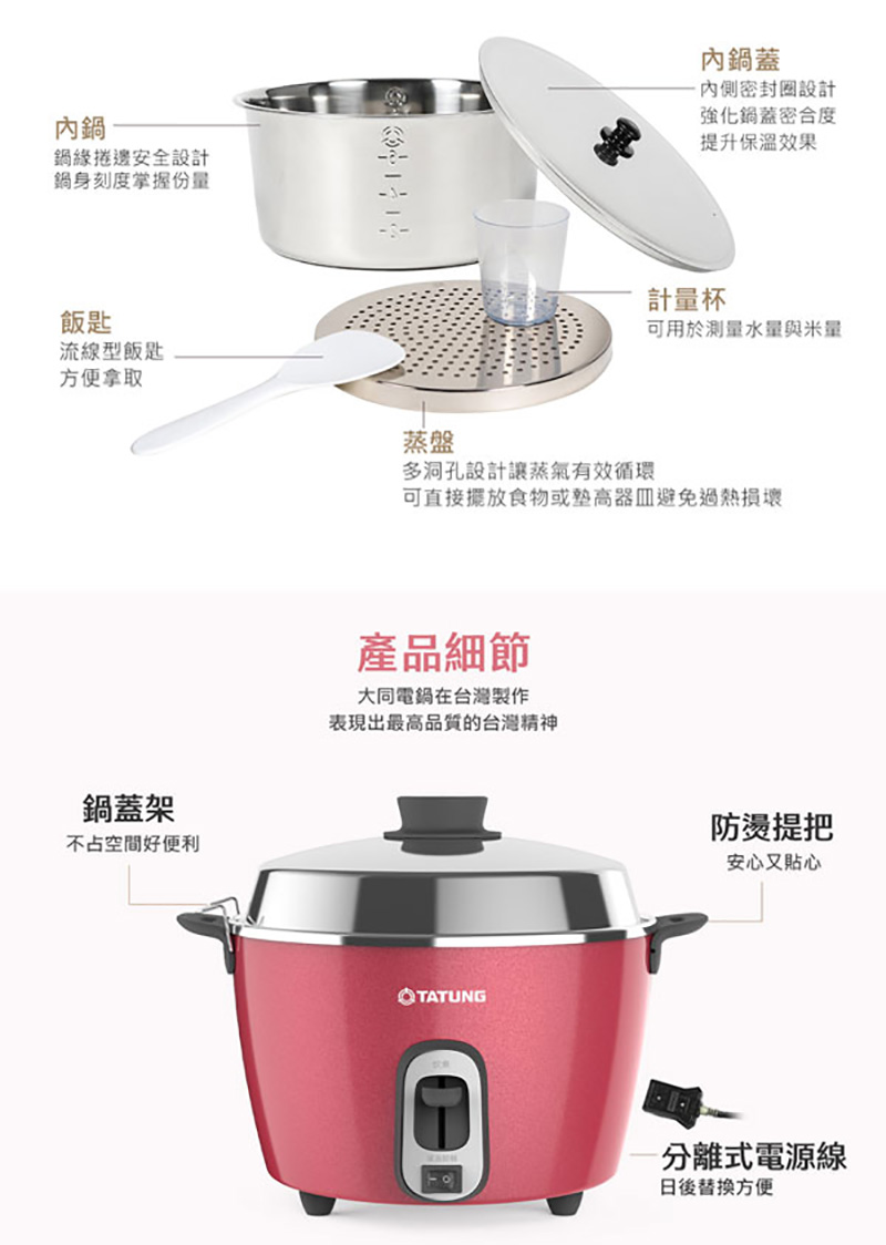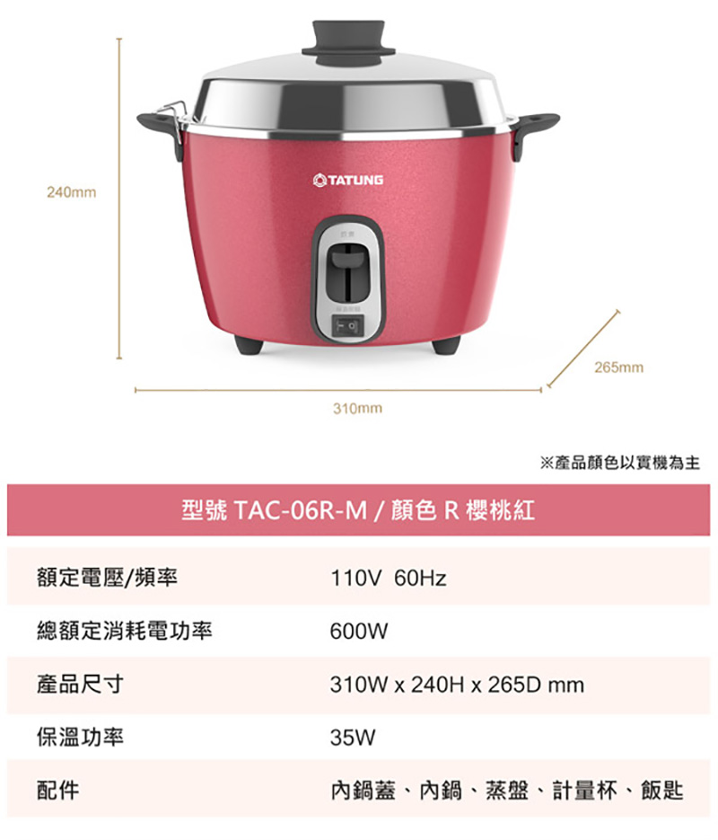 配件:量米杯、飯匙、蒸盤、內鍋、內鍋蓋、接地線、電源線