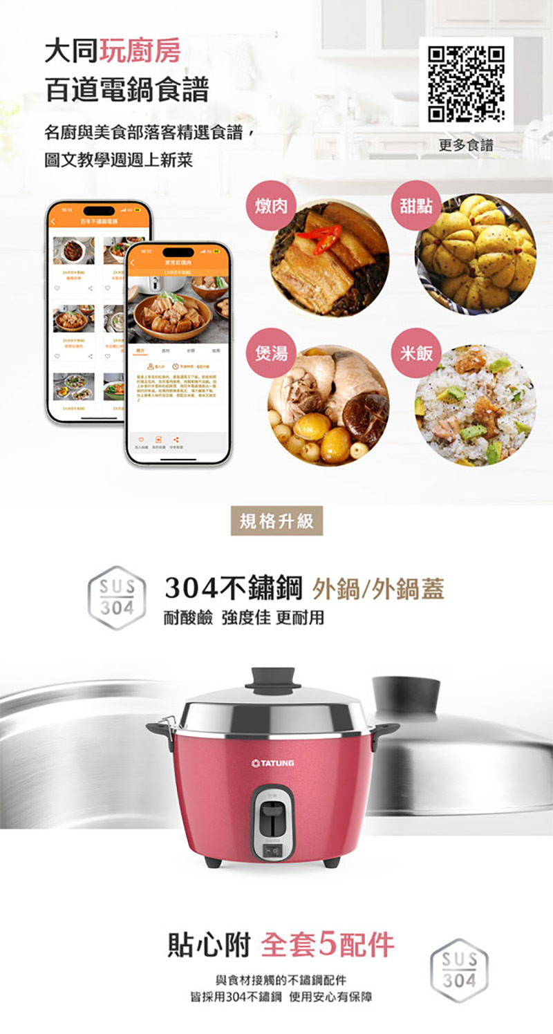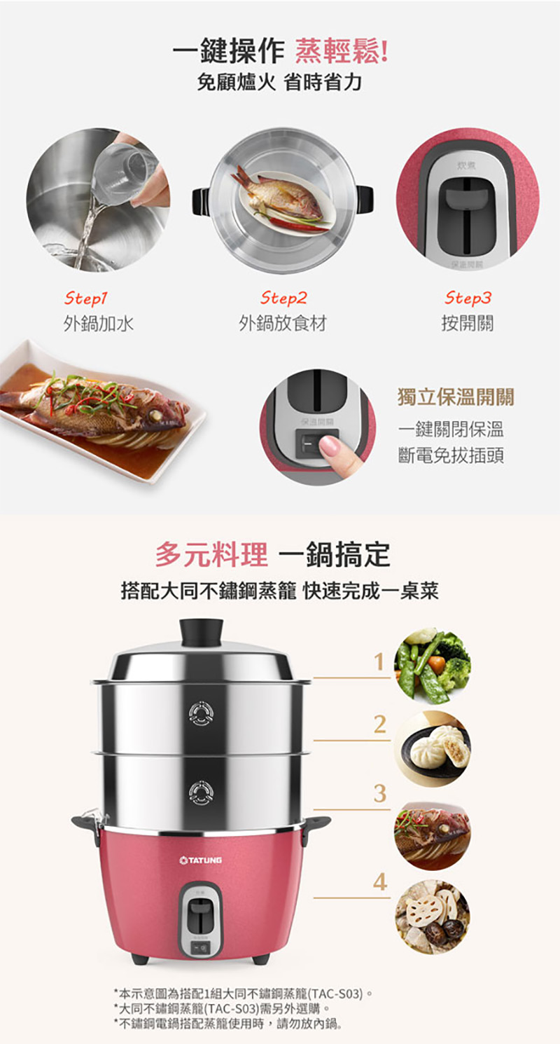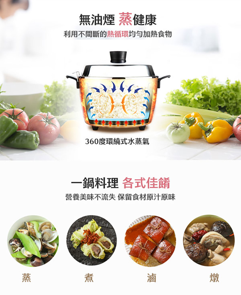 ◎多元料理,煮飯/粥、蒸、滷、燉多用途