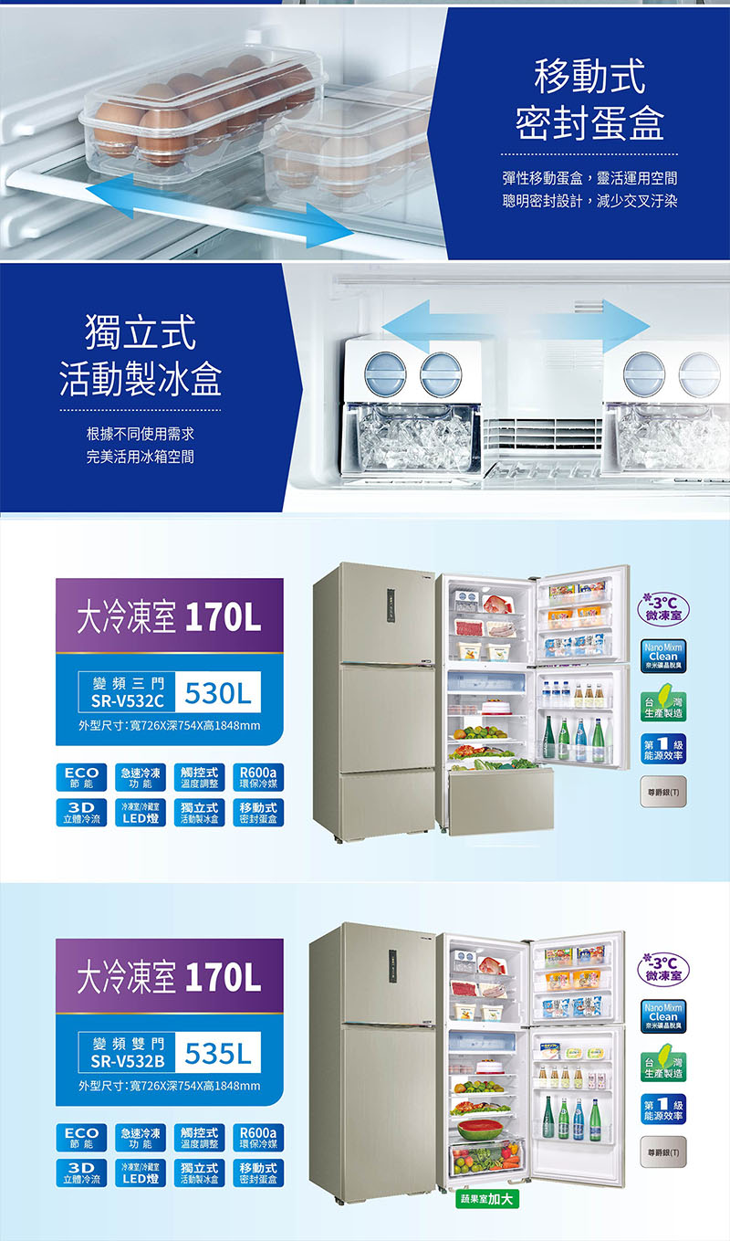 ◎容量:535公升 / 冷凍室 170 L / 冷藏室 365 L