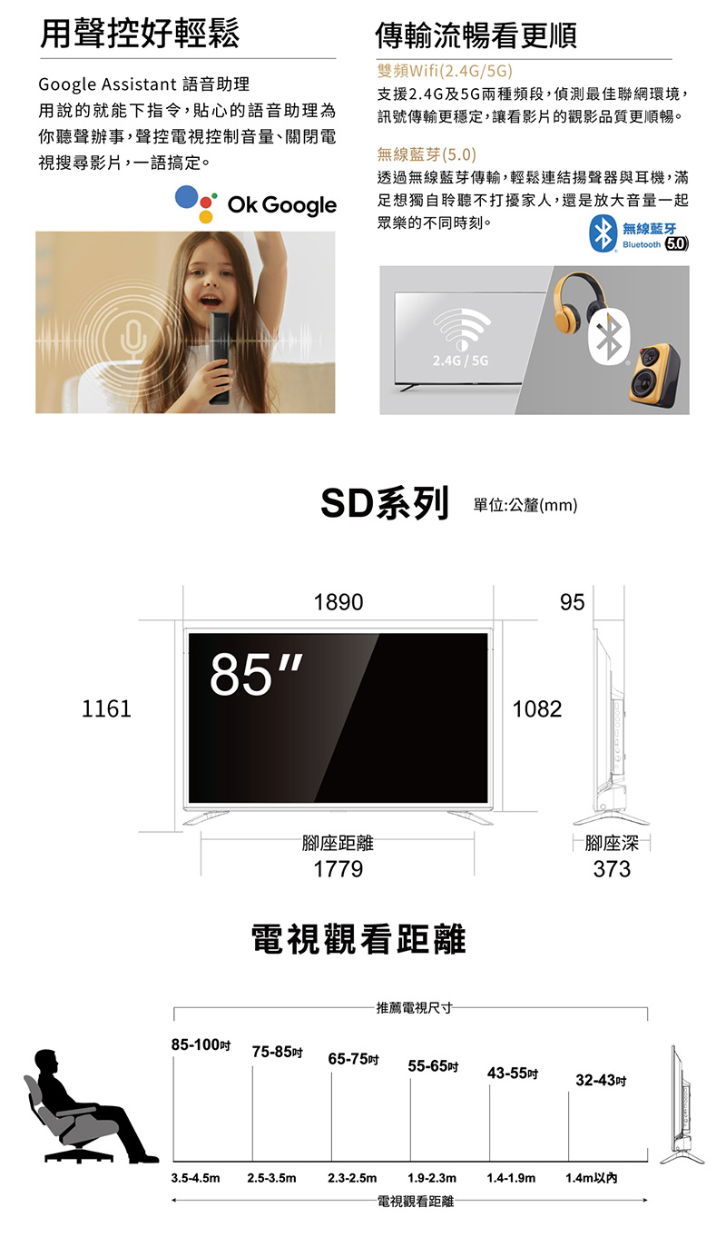 尺寸(寬x高x深):1890x1082X95mm(無腳座)/1894x1161X373mm(有腳座)