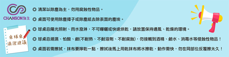【商品特色】 中華民國桌球協會認證比賽桌 國際標準規格274長×152.5寬×76高(cm) 桌面厚度25mm,採用進口桌球專用藍色檯面 桌框以60×30mm鐵框強固保護,耐撞擊不變形 桌腳採用60×60mm鋼管,並經雙重烤漆處理 100mm附固定剎鎖抗壓輪,可調節高低,穩固止滑,承受力大 【商品規格】 附贈超值配件組: 305高級比賽用藍色網架1組 強生高級正手桌拍2支 強生二星練習球半打 【贈送A式附件】 ■ 305 高級比賽用藍色網架1組 ■ 強生高級正手桌拍2支 ■ 強生二星練習球半打 【公司介紹】