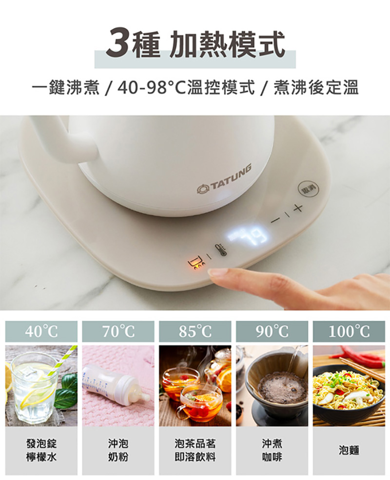 3種加熱|一鍵100°C沸煮、40-98°C控溫、沸騰定溫