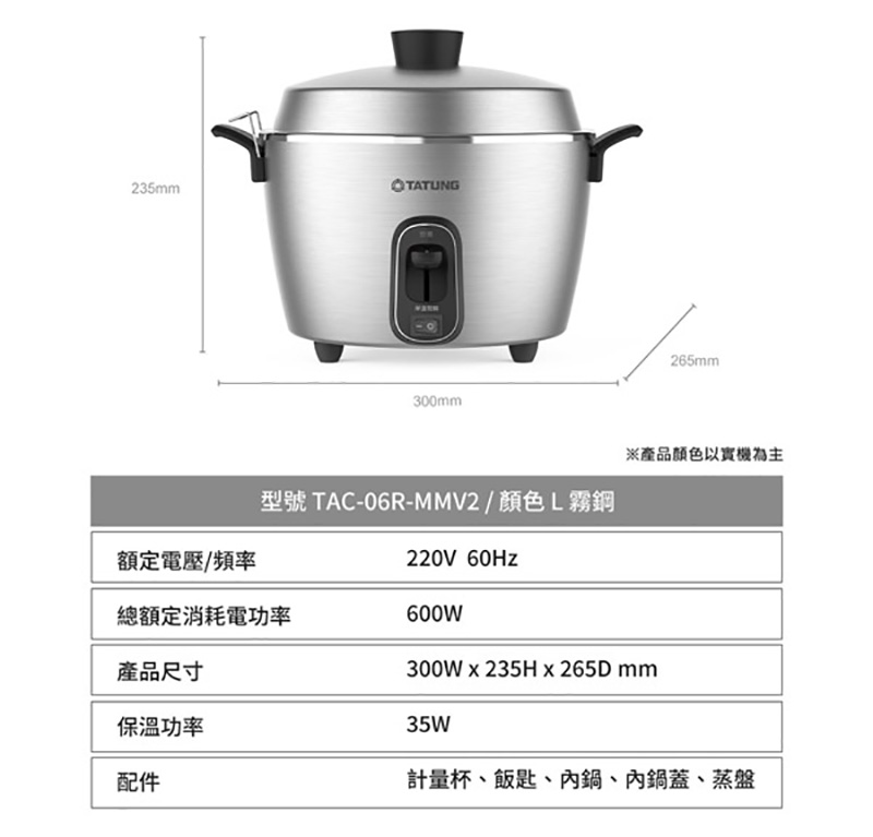 配件:量米杯、飯匙、蒸盤、內鍋、內鍋蓋