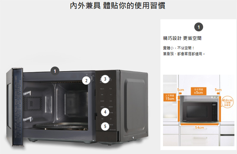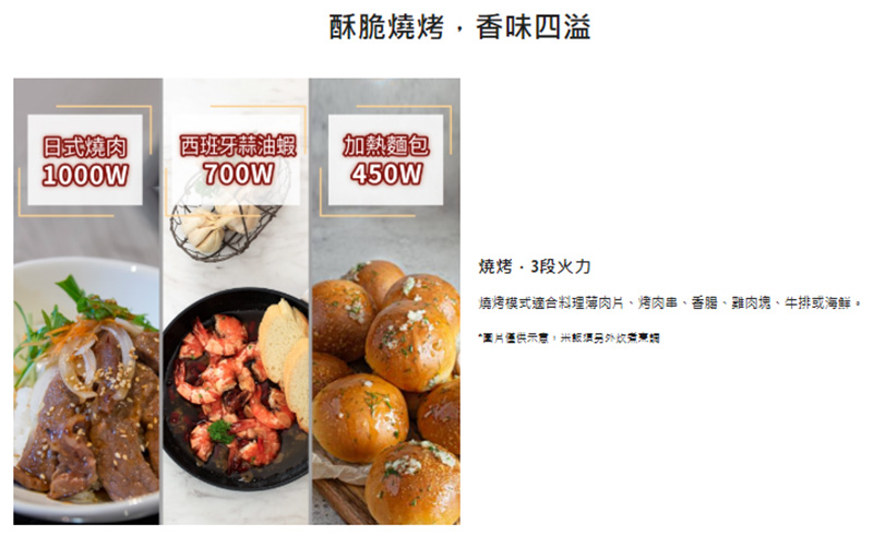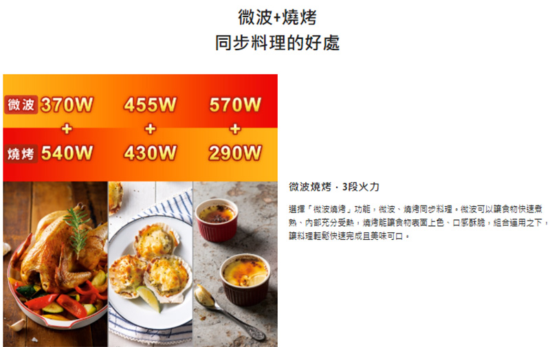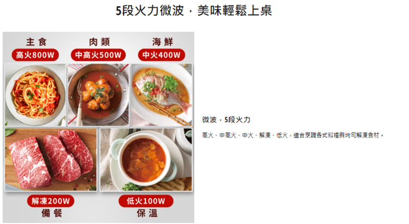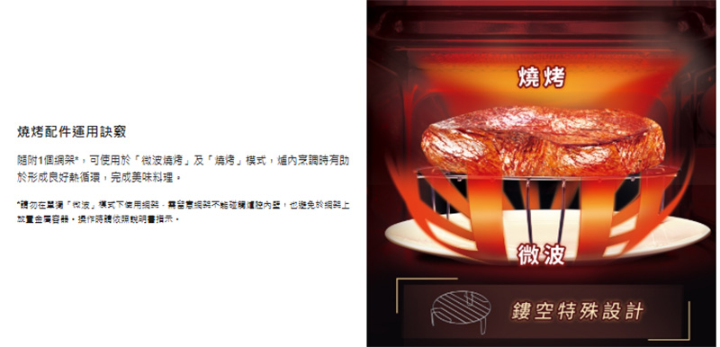 手動火力調節:微波5段;燒烤3段;微波燒烤3段