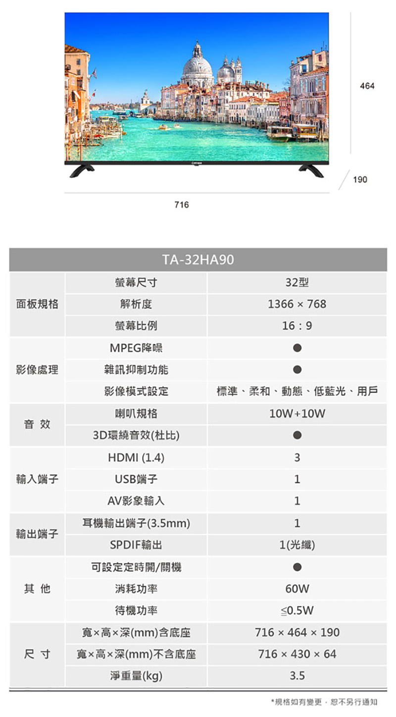 尺寸(寬x高x深):含底座 高464X寬716X深190(MM)