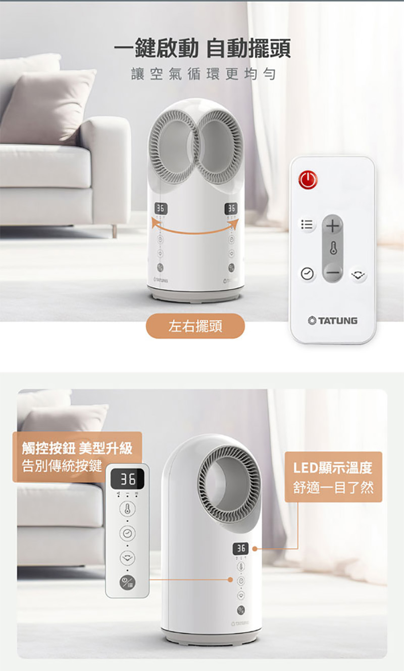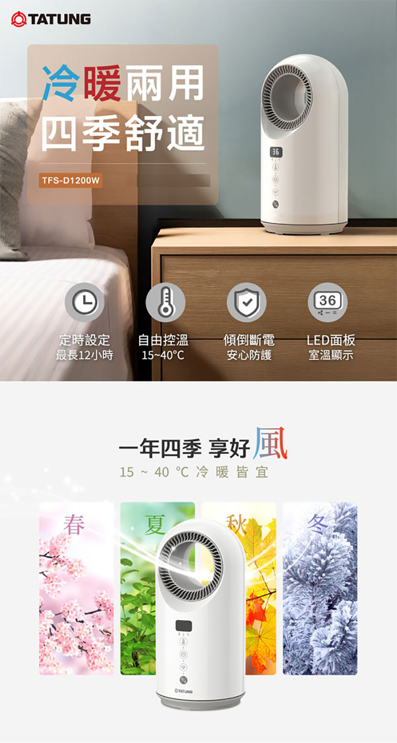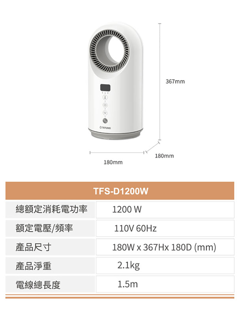 【商品介紹】 ◎PTC陶瓷加熱技術 ◎定時設定 最長12小時 ◎自由控溫15~40℃ ◎傾倒斷電安心防護 ◎過熱斷電保護 ◎LED面板室溫顯示 ◎一鍵啟動 自動擺頭 【商品規格】 品牌:TATUNG大同 產地:台灣 型號:TFS-D1200W 產品尺寸:180Wx367Hx180D(mm) 產品重量:2.1kg 保固:一年 電壓(V/Hz):110V/60Hz 消耗功率:1200W BSMI許可字號:R63830 【廠商介紹】 「大同」創立至今已近百年,為華人世界國貨代名詞,產品橫跨數位視訊、數位週邊、家電、新能源、能源資訊、重電、電線電纜、馬達等領域,經典家電產品「大同電鍋」於1960年問世,便開啟了台灣廚房電化革命,一直以來陪伴著你我成長,至今市佔率已超過九成,成為臺灣在地傳奇,也是全球華人的共同記憶。 大同品牌屢獲「臺灣優良品牌」之肯定,2011年亦獲得「台灣百大品牌」之榮耀,是台灣節能產業的領導先鋒。 責任代號:CCX