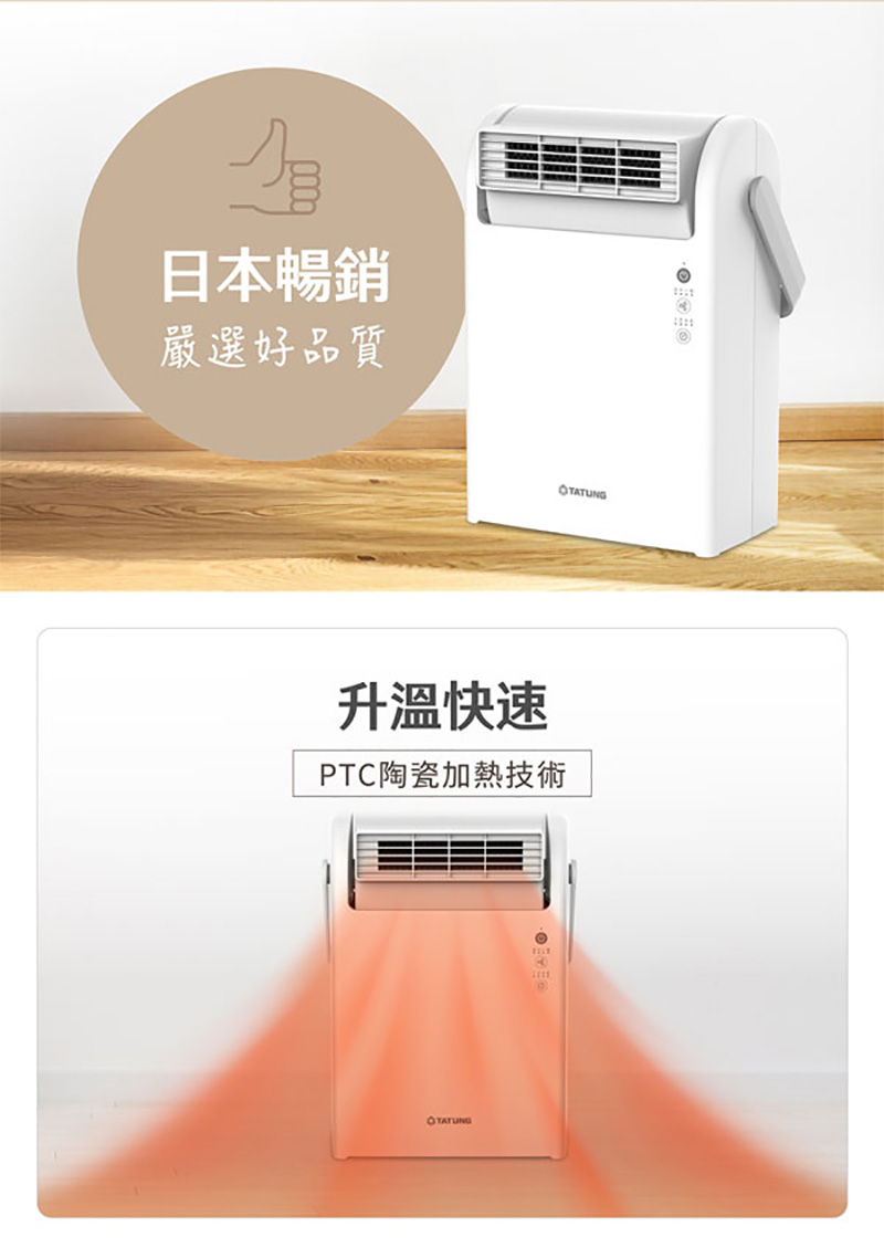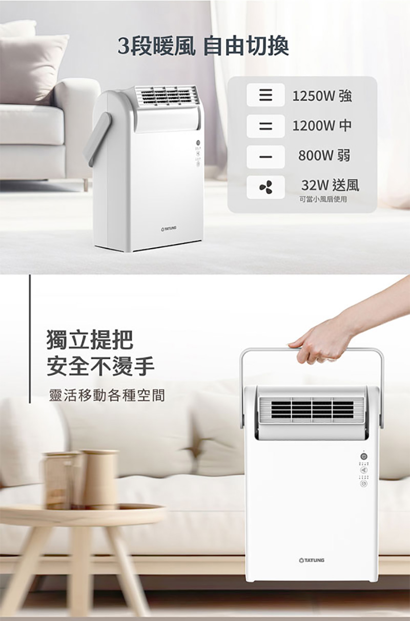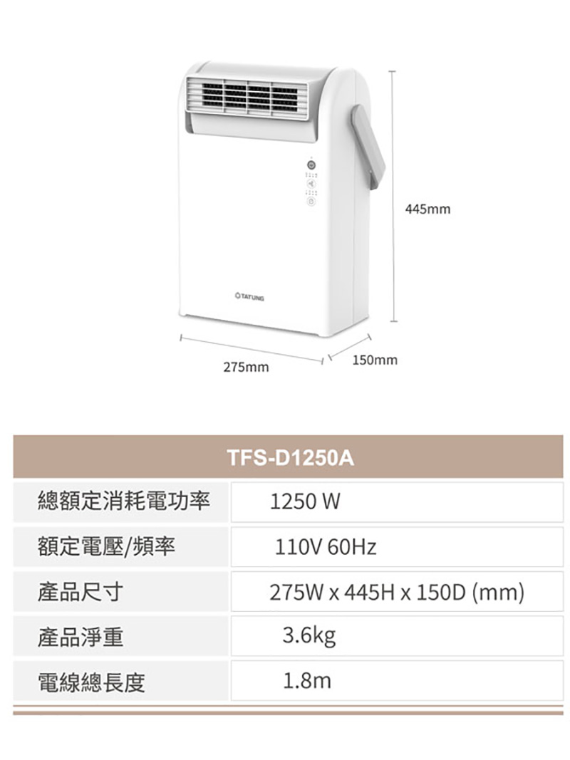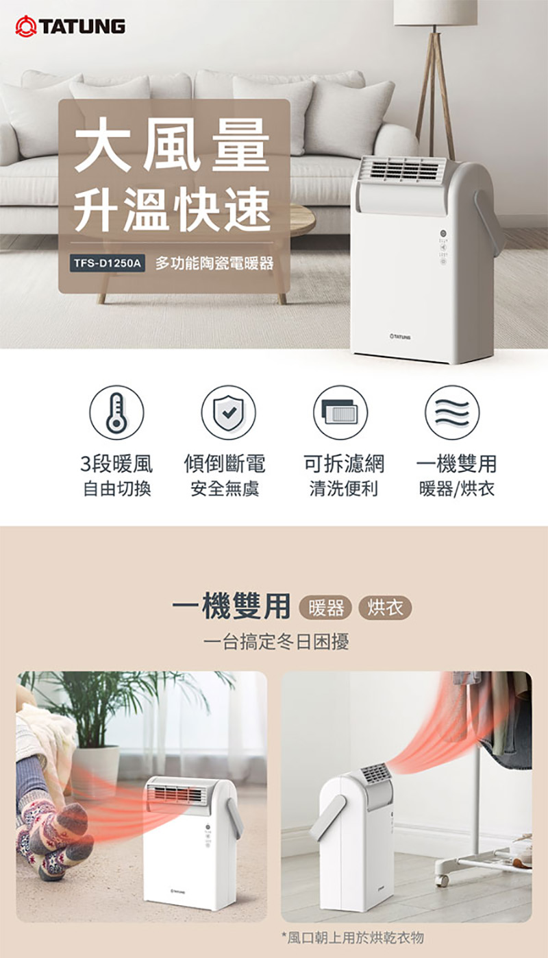 【商品介紹】 ◎PTC陶瓷加熱技術 ◎3段暖風 自由切換 ◎獨立提把 安全不燙手 ◎傾倒斷電 安全無虞 ◎過熱斷電保護 ◎最長8小時定時功能 ◎可拆濾網 清洗便利 ◎一機雙用 (暖器/烘衣) 【商品規格】 品牌:TATUNG大同 產地:台灣 型號:TFS-D1250A 產品尺寸:275Wx445Hx150D(mm) 產品重量:3.6kg 保固:一年 電壓(V/Hz):110V/60Hz 消耗功率:1250W BSMI許可字號:R63830 【廠商介紹】 「大同」創立至今已近百年,為華人世界國貨代名詞,產品橫跨數位視訊、數位週邊、家電、新能源、能源資訊、重電、電線電纜、馬達等領域,經典家電產品「大同電鍋」於1960年問世,便開啟了台灣廚房電化革命,一直以來陪伴著你我成長,至今市佔率已超過九成,成為臺灣在地傳奇,也是全球華人的共同記憶。 大同品牌屢獲「臺灣優良品牌」之肯定,2011年亦獲得「台灣百大品牌」之榮耀,是台灣節能產業的領導先鋒。 責任代號:CCX