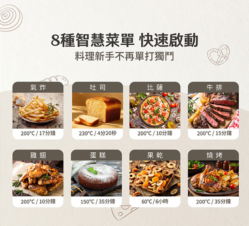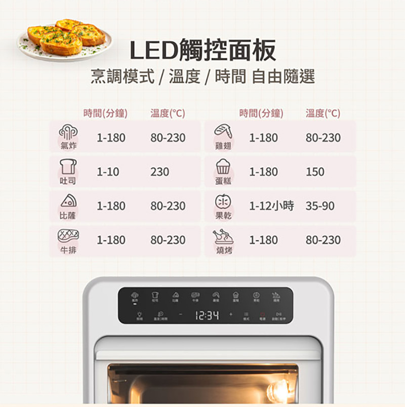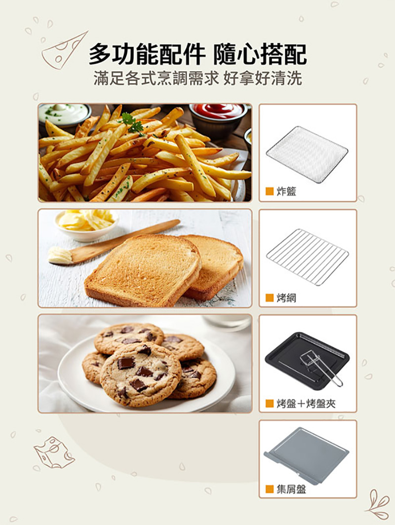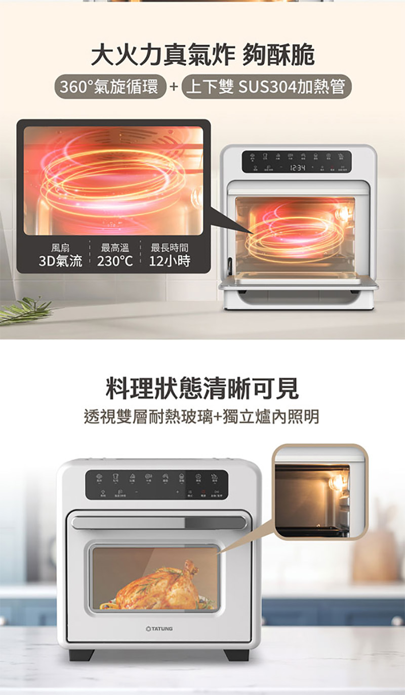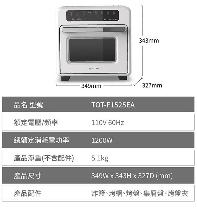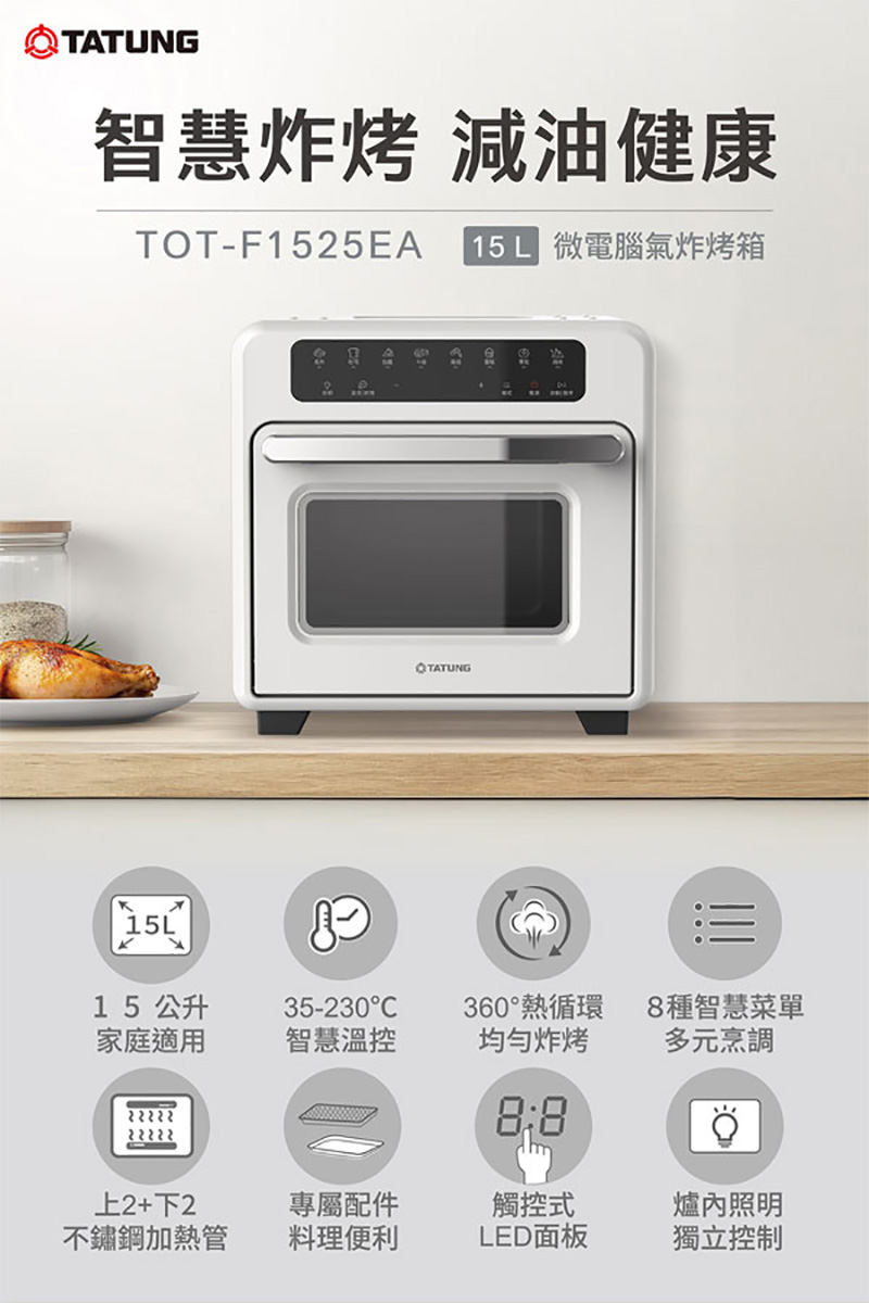 【商品介紹】 ◎15公升 家庭適用 ◎35-230℃ 智慧溫控 ◎360°熱循環 均勻炸烤 ◎8種智慧菜單 多元烹調 ◎上2+下2 不鏽鋼加熱管 ◎專屬配件 料理便利 ◎觸控式 LED面板 ◎爐內照明 獨立控制 【商品規格】 品牌:TATUNG大同 型號:TOT-F1525EA 產地:中國 商品尺寸(材積):349Wx343Hx327D(mm) 電壓:110V 頻率:60Hz 產品重量:5.1kg 容量:20-30L 保固:1年 消耗功率:1200W BSMI許可字號:R31001 【廠商介紹】 「大同」創立至今已近百年,為華人世界國貨代名詞,產品橫跨數位視訊、數位週邊、家電、新能源、能源資訊、重電、電線電纜、馬達等領域,經典家電產品「大同電鍋」於1960年問世,便開啟了台灣廚房電化革命,一直以來陪伴著你我成長,至今市佔率已超過九成,成為臺灣在地傳奇,也是全球華人的共同記憶。 大同品牌屢獲「臺灣優良品牌」之肯定,2011年亦獲得「台灣百大品牌」之榮耀,是台灣節能產業的領導先鋒。 責任代號:CCX