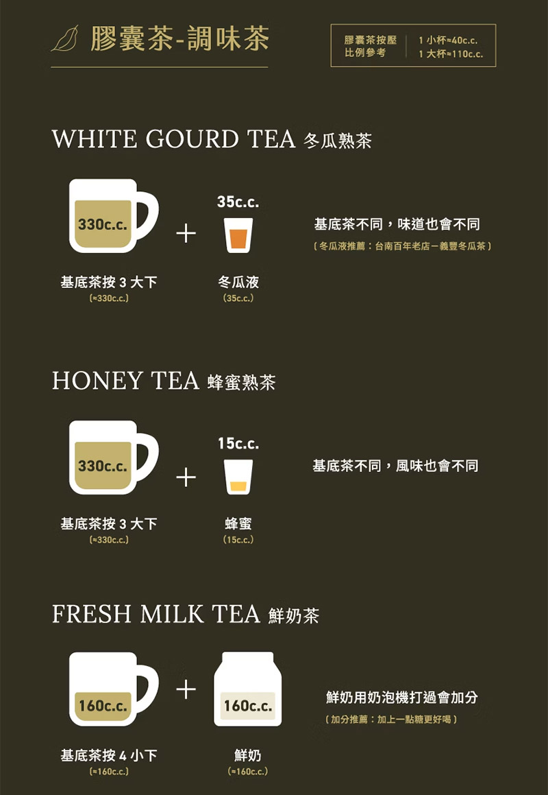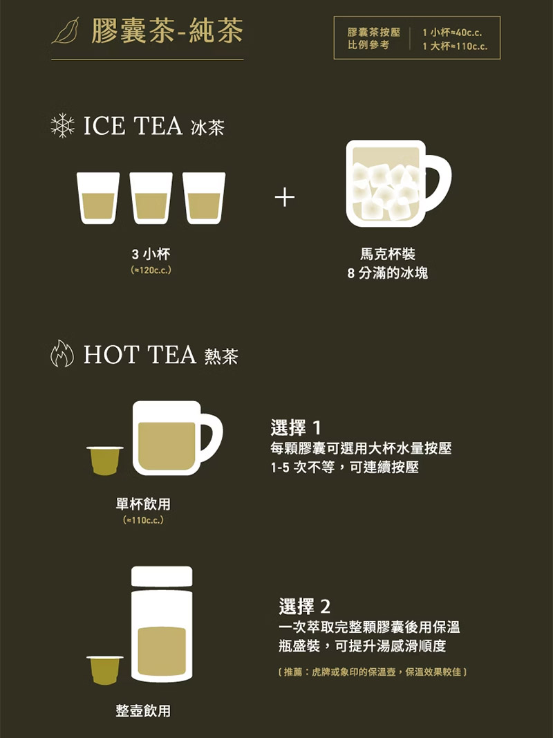 熱飲建議: 直接按大杯(約110ml),可依照個人口味喜好沖泡 1–5次,風味會逐漸變淡但仍保有茶韻。
