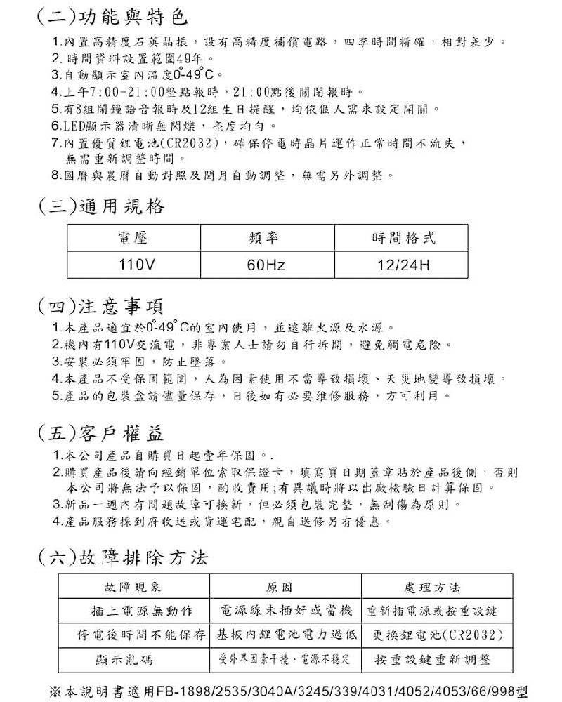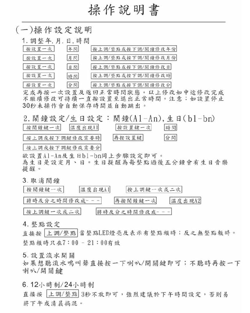 時間可切換12小時制/24小時制,可設定8組鬧鐘,3組生日、整點報時。