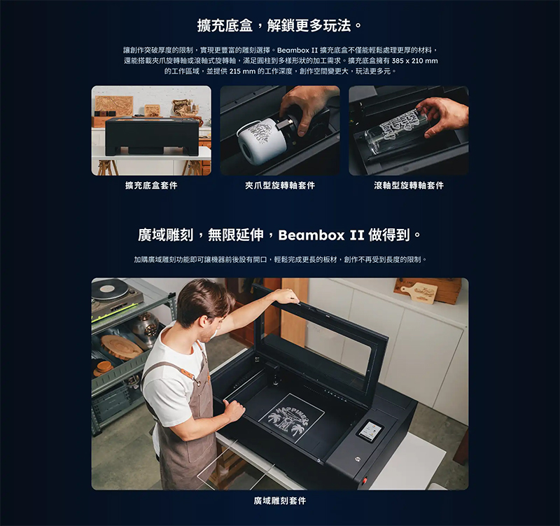 Beambox II 支援曲面雕刻、擴充底盒套件提供更厚的工作深度至 215mm,
