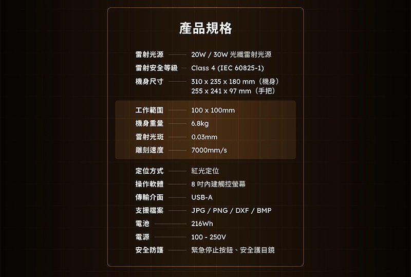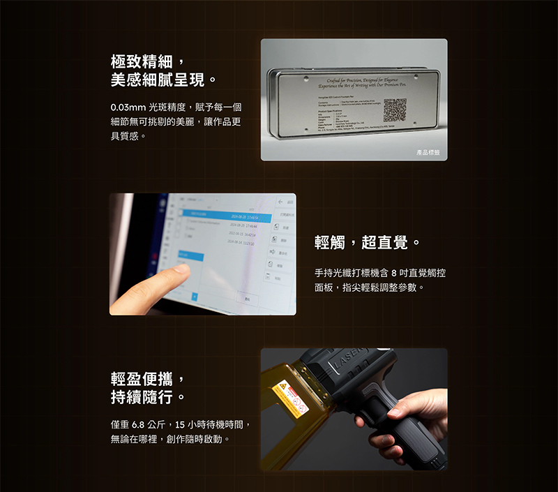 具備 7000mm/s 打標速度,0.03mm 超精細光斑,6.8 公斤的輕巧設計,