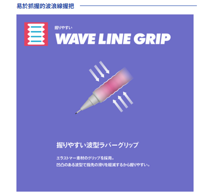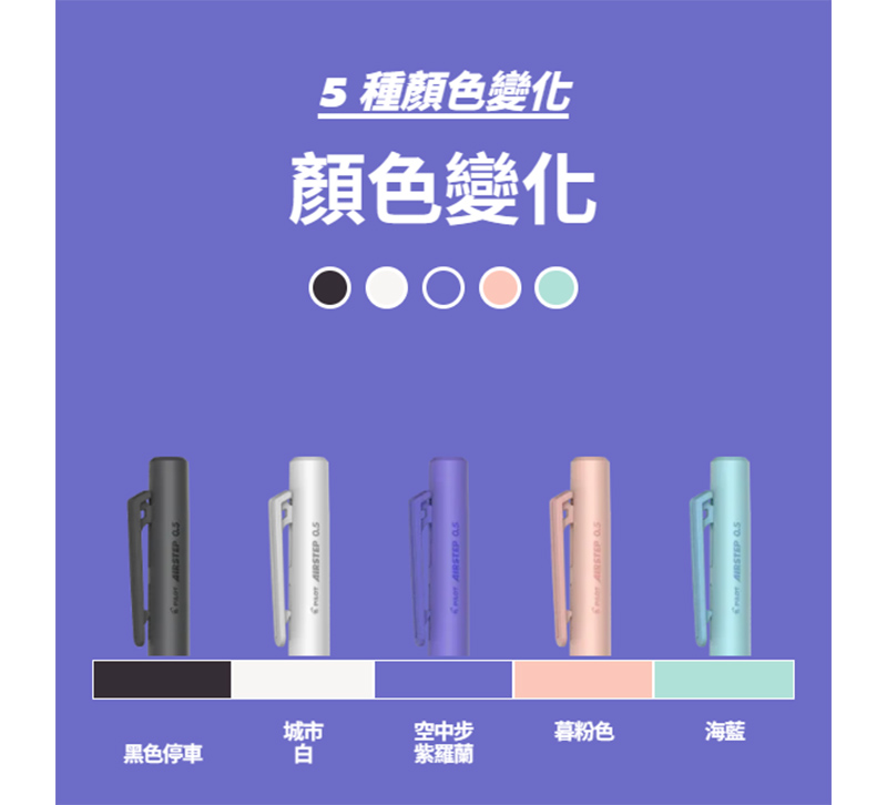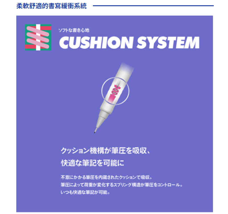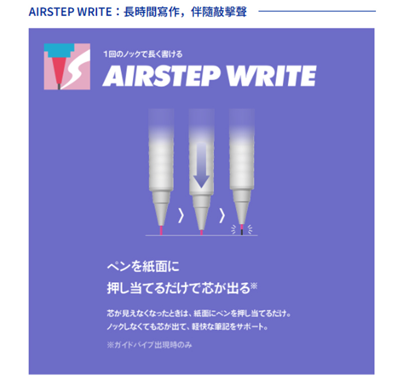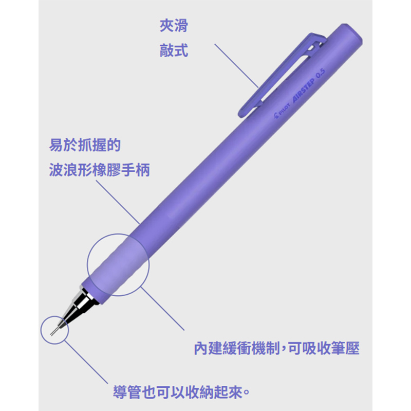 【商品特色】 全新系列 自動鉛筆AIRSTEP新登場!! 輕快順暢的書寫感,讓你的校園生活也隨之輕盈自在! AIRSTEP WRITE:當筆芯用完時,在筆尖端伸出的狀態下, 輕輕將筆尖按在紙面上,筆芯就會自動出現,可持續享受輕快的書寫感。 CUSHION SYSTEM:透過隨筆壓變化的彈簧結構,在輕筆壓時提供輕盈的支撐, 在重筆壓時則以較大的負荷控制緩衝,帶來舒適的書寫體驗。 WAVE LINE GRIP:採用波浪狀握把設計,提供適度的阻力感以減少指尖滑動, 並使用彈性體材質打造,握感更加舒適。 【商品規格】 芯徑:0.5毫米 方法:夾式滑桿 內管:ABS;握把:彈性體;軸:ABS + 傳動 旋鈕:ABS;夾子:PC;底座:黃銅 + 鍍錫鈷 尺寸:最大直徑φ10.5mm,總長137.7mm 重量:11.6克 獨立包裝尺寸:195×50×11毫米 單件包裝重量:13.6克/自封袋 橡皮:HERFN-10 顏色: HAS-15-PKB 極致黑4902505685576 HAS-15-UBW 都會白4902505685583 HAS-15-ASV 空步紫4902505685590 HAS-15-SEL 海洋藍4902505685606 HAS-15-DKP 夕陽粉4902505685613 【商品介紹】 【廠商介紹】