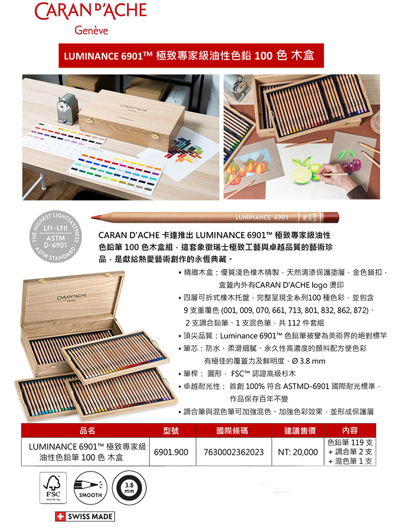 CARAN dACHE 瑞士卡達 LUMINANCE 6901™ 極致專家級 油性色鉛筆 100 色 木盒 /組 6901.900