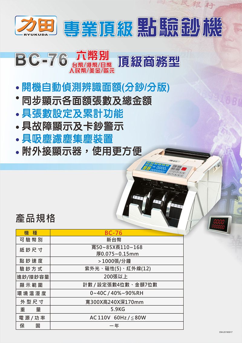 【商品特色】 六幣別(台幣/港幣/日幣/人民幣/美金/歐元) 開機自動偵測辨識面額(分秒/分版) 同步顯示各面額張數及總金額 具張數設定及累計功能 具故障顯示及卡鈔警示 具吸塵濾塵集塵裝置 附外接顯示器使用更方便 【商品介紹】 廠商代號:MC1 責任代碼:QMW