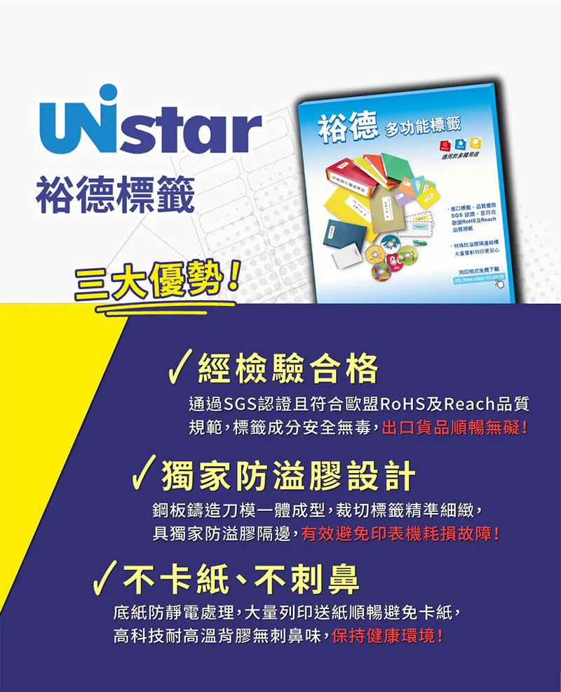 從面紙吸墨塗層、高耐溫科技背膠、鋼鑄刀模裁切、特殊防溢膠隔邊、底紙靜電處理等高成本的專業生產技術,是Unistar裕德標籤對品質的堅持及能行銷亞洲市場(台灣/香港/新加坡/中國)的不二法門。