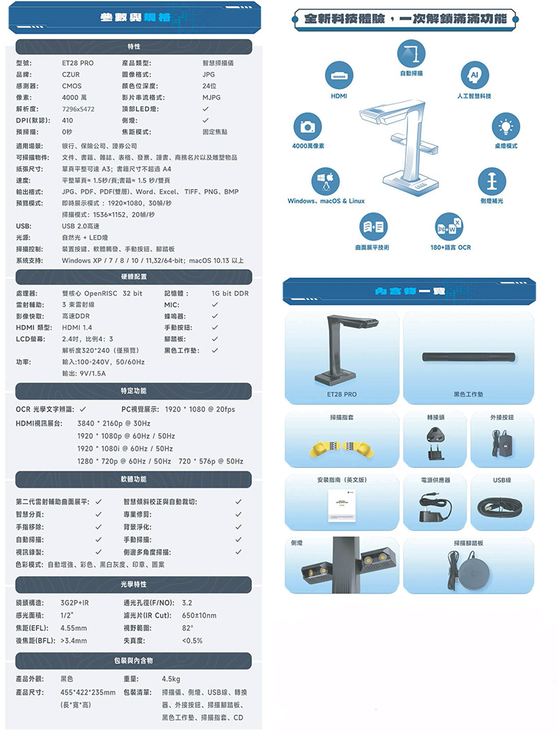 為專業職人設計的天生王者 為專業職人設計的天生王者 單頁文件≈1.5秒/頁;書籍≈1.5秒/雙頁 圖元:4000萬 410DPI OCR文字識別,支援共180+種語言 掃描幅面:單頁檔≤A3,已裝訂書籍≤A4 【品牌介紹】 廠商代號:CN 責任代號:QMW
