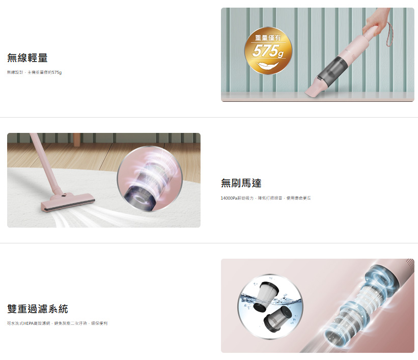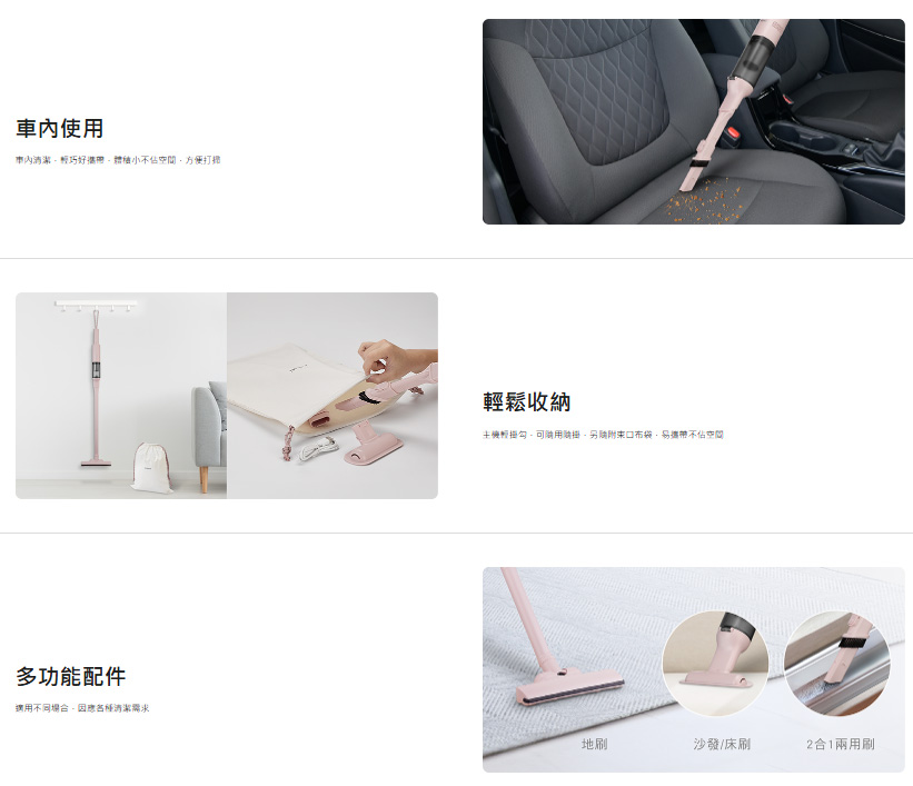 內容物:主機、地刷、沙發刷、細嘴刷、延長管、充電線、收納袋