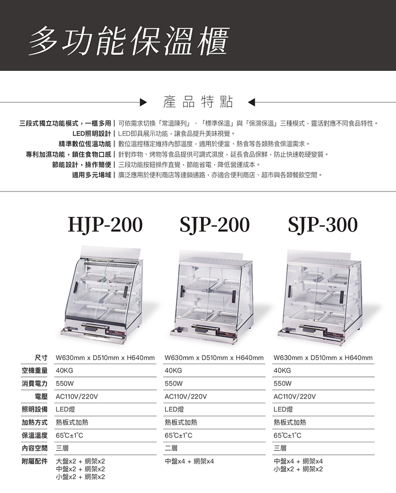 【商品規格】 型號:SJP-300 空機重量:40kg 消費電力:550w 尺寸:630x510x640mm 電壓:AC110V 220V 照明設備:LED燈 加熱方式:熱板式加熱 保溫溫度:65度C正負1度C 內容空間:三層 【商品介紹】 【廠商介紹】 近年來,社會生活結構的改變,外食人口比例的增加。本公司亦有鑑於此, 對於外食需求提供消費者,在清蒸與保溫食品上,提供物美價廉的食品機器, 讓多樣化的飲食文化亦能與時代之進步相進展。因此近年來本公司開發生產販售各種飲食機器, 都能夠得到各界的好評。 本公司亦朝著國際經營多角化,對於開發、設計、製程、物流與售後服務上, 秉持著信用、確實以專職之理念,對業界裡販售業者,提供最優的食品機器,以滿足消費者的需求。 廠商代號:CR2 責任代號:QMW