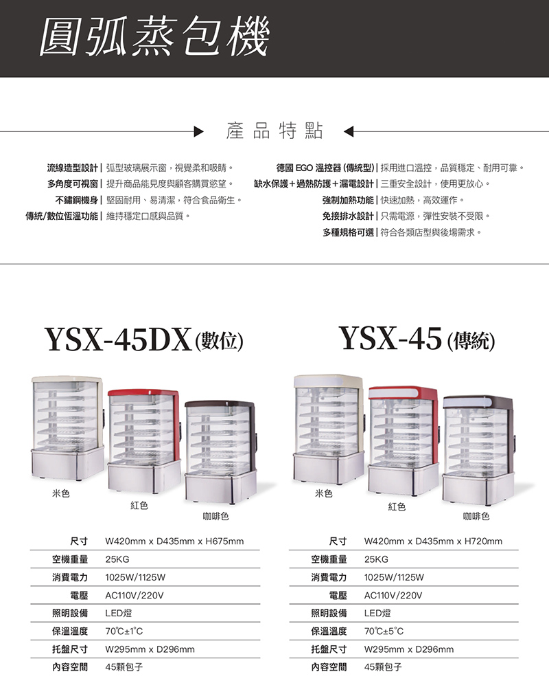 【商品規格】 型號:YSX-45DX 空機重量:25kg 尺寸:420x435x675mm 消費電力:1025w / 1125w 電壓:AC110v / 220V 照明設備:LED燈 保溫溫度:70度C正負5度C 托盤尺寸:W295xD296mm 內容空間:約45顆包子 【商品介紹】 【廠商介紹】 近年來,社會生活結構的改變,外食人口比例的增加。本公司亦有鑑於此, 對於外食需求提供消費者,在清蒸與保溫食品上,提供物美價廉的食品機器, 讓多樣化的飲食文化亦能與時代之進步相進展。因此近年來本公司開發生產販售各種飲食機器, 都能夠得到各界的好評。 本公司亦朝著國際經營多角化,對於開發、設計、製程、物流與售後服務上, 秉持著信用、確實以專職之理念,對業界裡販售業者,提供最優的食品機器,以滿足消費者的需求。 廠商代號:CR2 責任代號:QMW