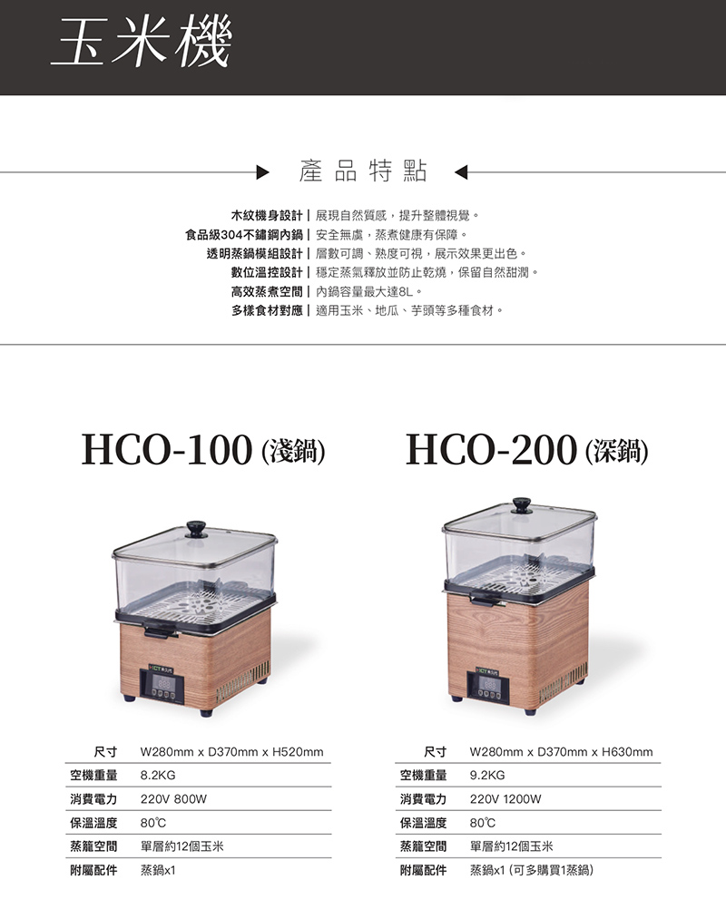 【商品規格】 型號:HCO-100 外型尺寸:W280mm*D370mm*H520mm 電源規格:110V/ 220V 800W 重量:8.2KG 保溫溫度:80度 蒸籠空間:單層約12支玉米 附屬配件:蒸鍋 【商品介紹】 【廠商介紹】 近年來,社會生活結構的改變,外食人口比例的增加。本公司亦有鑑於此, 對於外食需求提供消費者,在清蒸與保溫食品上,提供物美價廉的食品機器, 讓多樣化的飲食文化亦能與時代之進步相進展。因此近年來本公司開發生產販售各種飲食機器, 都能夠得到各界的好評。 本公司亦朝著國際經營多角化,對於開發、設計、製程、物流與售後服務上, 秉持著信用、確實以專職之理念,對業界裡販售業者,提供最優的食品機器,以滿足消費者的需求。 廠商代號:CR2 責任代號:QMW