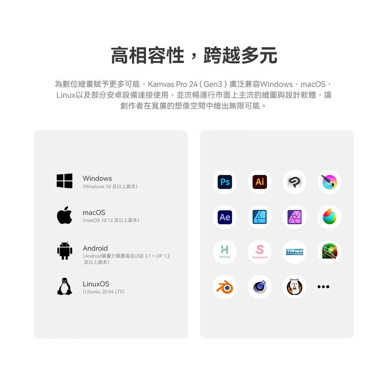 作業系統:Windows 10、macOS 10.12 或以上、Android (USB3.1 DP1.2或以上)/Linux(Ubuntu 20.04 LTS)