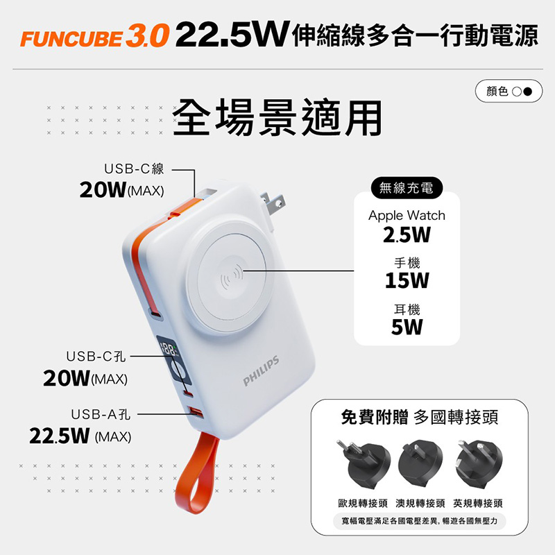 USB-A輸出:5V-3A,9V/2A,10V/2.25A,12V-1.5A(Max.:22.5W)