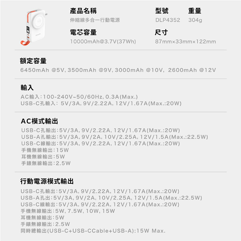 同時充放模式(USB-C輸入,USB-CCable+USB-A):15W Max.
