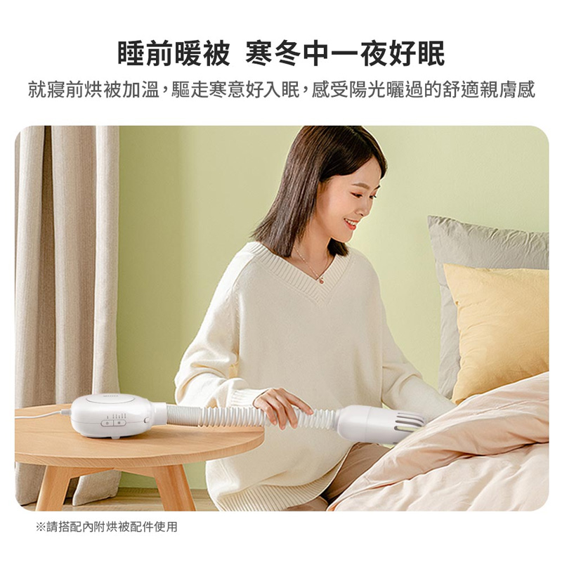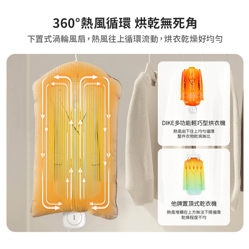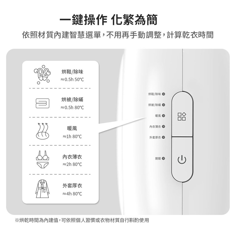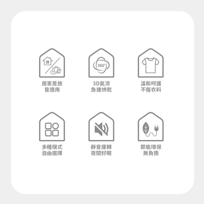 輕巧不佔空間,快速烘乾衣物、毛巾、鞋子與各式衣物,也可當作烘被機,四季皆可使用。靜音運轉、溫和不傷纖維,居家、宿舍皆適用,隨時享受柔暖乾爽。