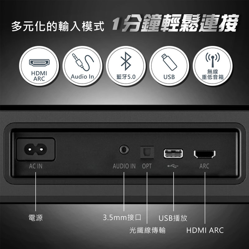 ◎支援藍牙USBAux-inHDMI (ARC)Optical光纖等音訊模式