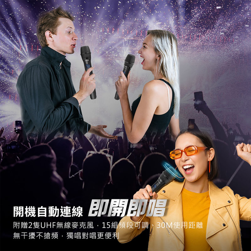 配件:說明書保固卡、遙控器、3.5mm音源線、電源線、無線麥克風*2