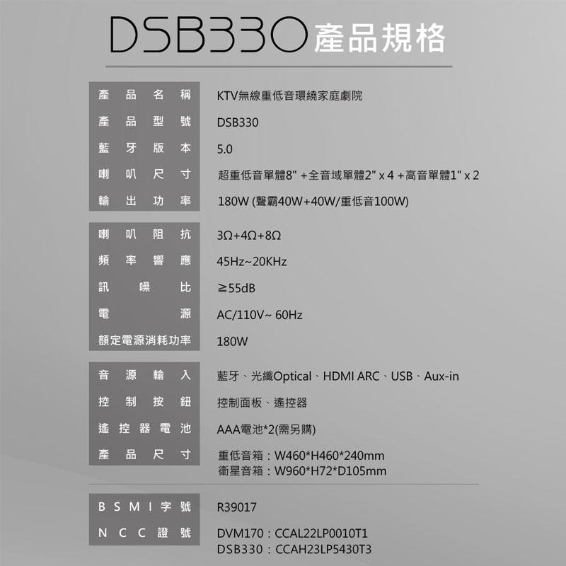 輸出功率:180W (Sound Bar40W+40W/重低音100W)
